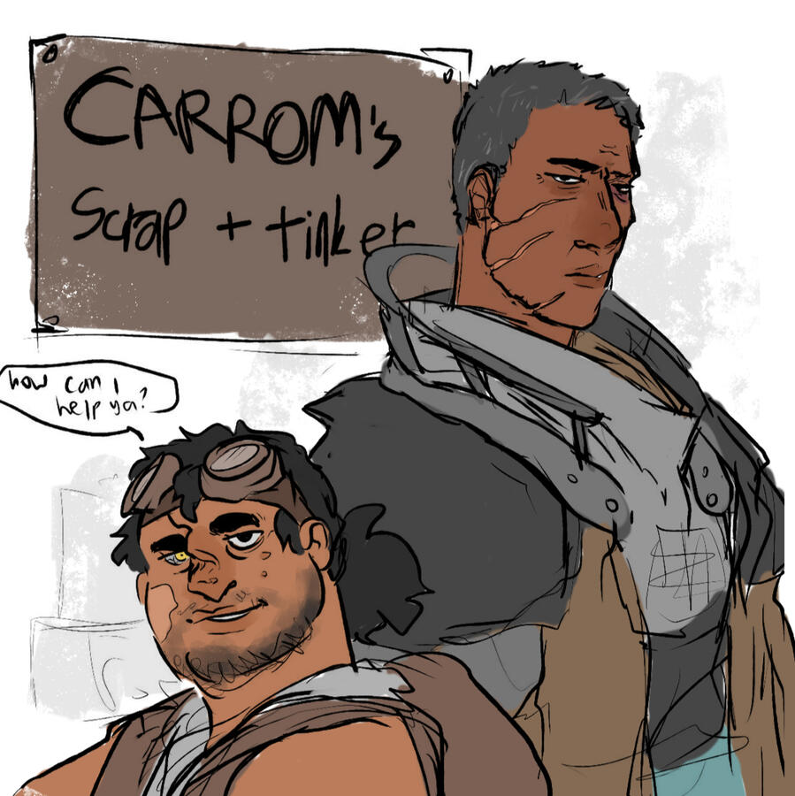 Character profiles for a travelling duo of a skeevy merchant and a quiet bodyguard based off the IP Fallout. Includes writeouts for bios of their appearance, personality and history as well as relationship navigation and S.P.E.C.I.A.L stats. Also includes character design artwork.